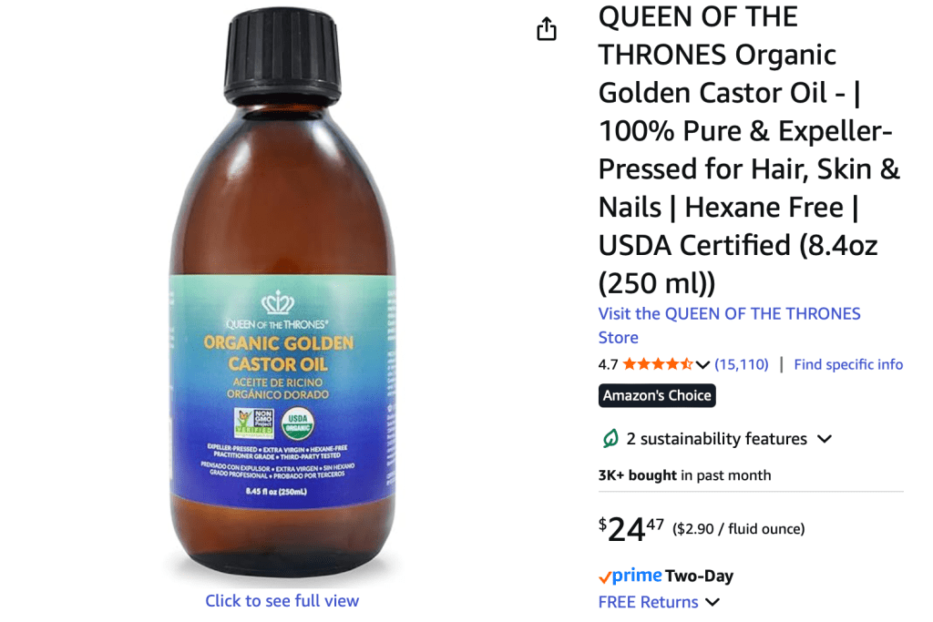 Link to the castor oil on Amazon: https://a.co/d/74lZuJC