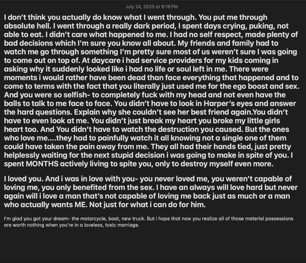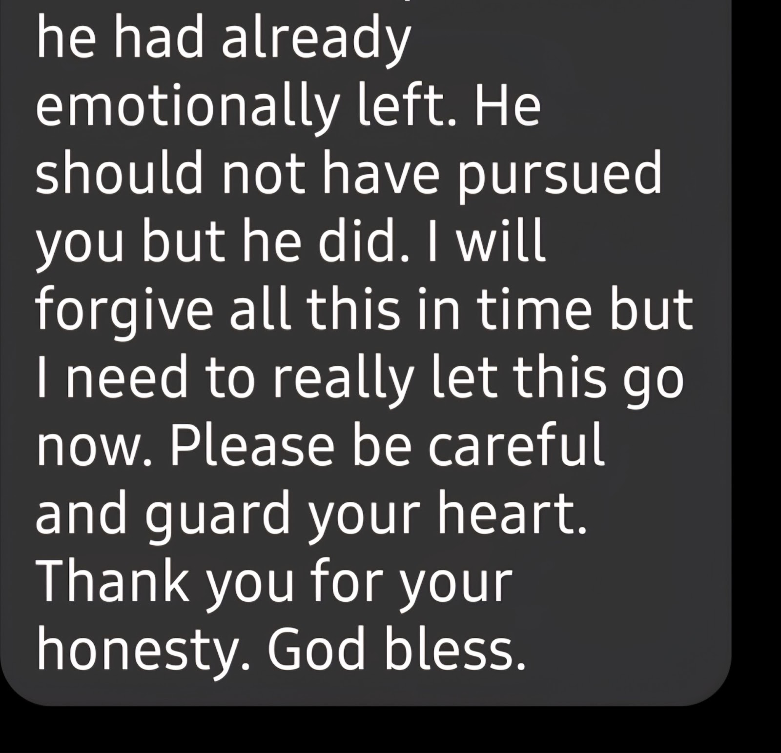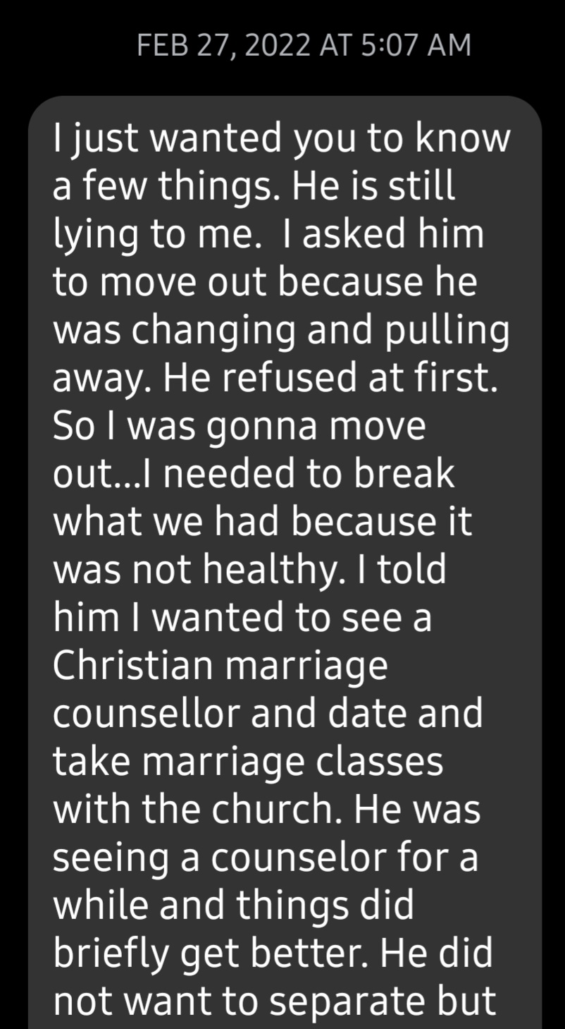 Eventually some time went by and his wife got a message telling her that her husband was cheating on her with me. He called me absolutely panicking asking what I was going to tell her. I remember that particular weekend I was pretty mad at him because he was being distant and mean so you better believe I told her everything. I don’t know if it was my way of getting back at him or if it was an attempt to clear my own conscience. But I did also find out at this time that she thought that they were separating for space, they were going to go to counseling and work on their marriage. I found out that he had been having family dinners there, holding hands on Christmas, a whole slew of things I didn’t know. She sent me a screenshot from texts from THAT DAY where he was telling her he still loved her.