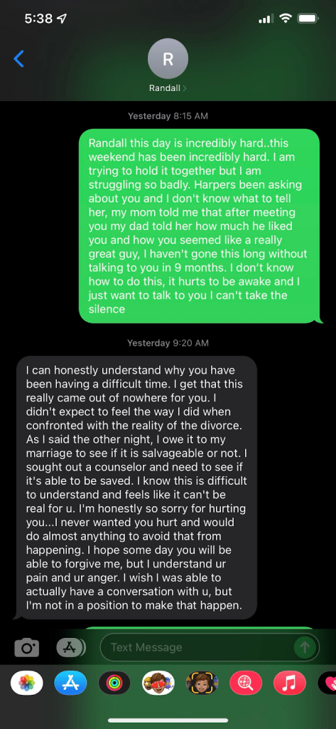 Fast forward a couple months and I got a call from his work. The call ended before I could even pick up. Something in me just knew it was him. And I was mad. I was mad because he didn’t just have the right to pop back into my life because he was having a bad day, or bad life, which is what I assumed was happening. I fought with myself deciding whether to text him or his wife. I ended up texting him a screenshot of the call and said “this better be some kind of sick joke.” He didn’t respond. But the next day I got another call from his work…this time I answered BEFORE he hung up. He had his tail between his legs and was apologizing to me for what he put me through.