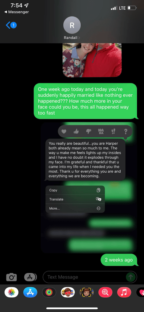 Some of this time frame is a blur and I don’t exactly remember how things really ramped up. I do remember that he had told me he had gone through a divorce and was on his second. I said, “second divorce?” To which he responded, “lol some days I wonder…” but that he was in his second marriage.