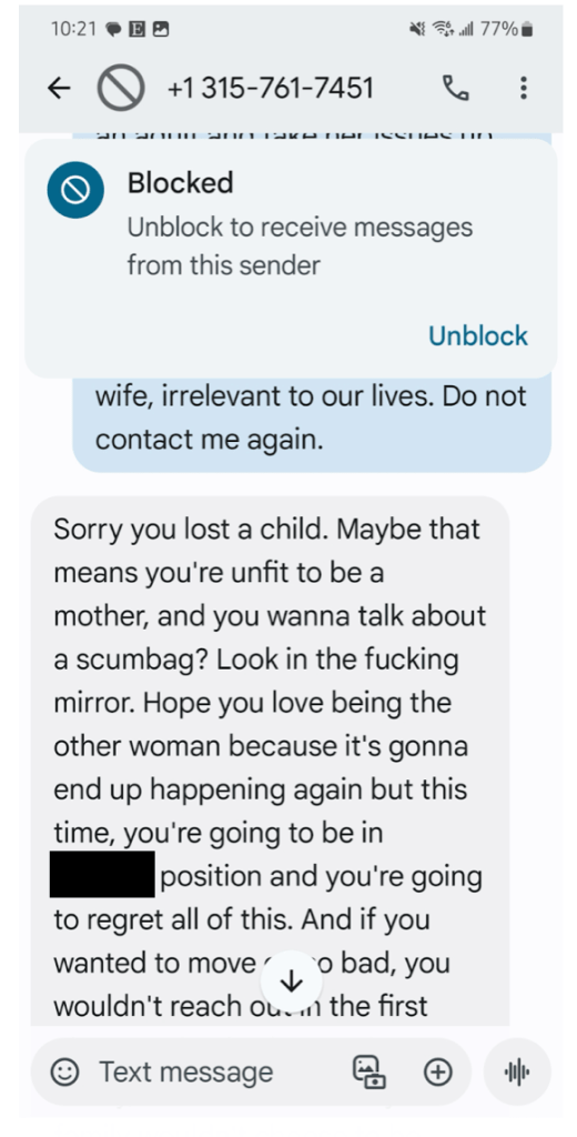 I came into work the following day, even more of a shell of a human. My good friend/coworker was extremely concerned about me and reached out to Randall on facebook telling him what had happened and saying she was really worried. There was no response but a couple days later when she went into Kinney Drugs she saw his wife and a neighbor from the distance and moments later the neighbor came up to her telling her not to contact Randall ever again.